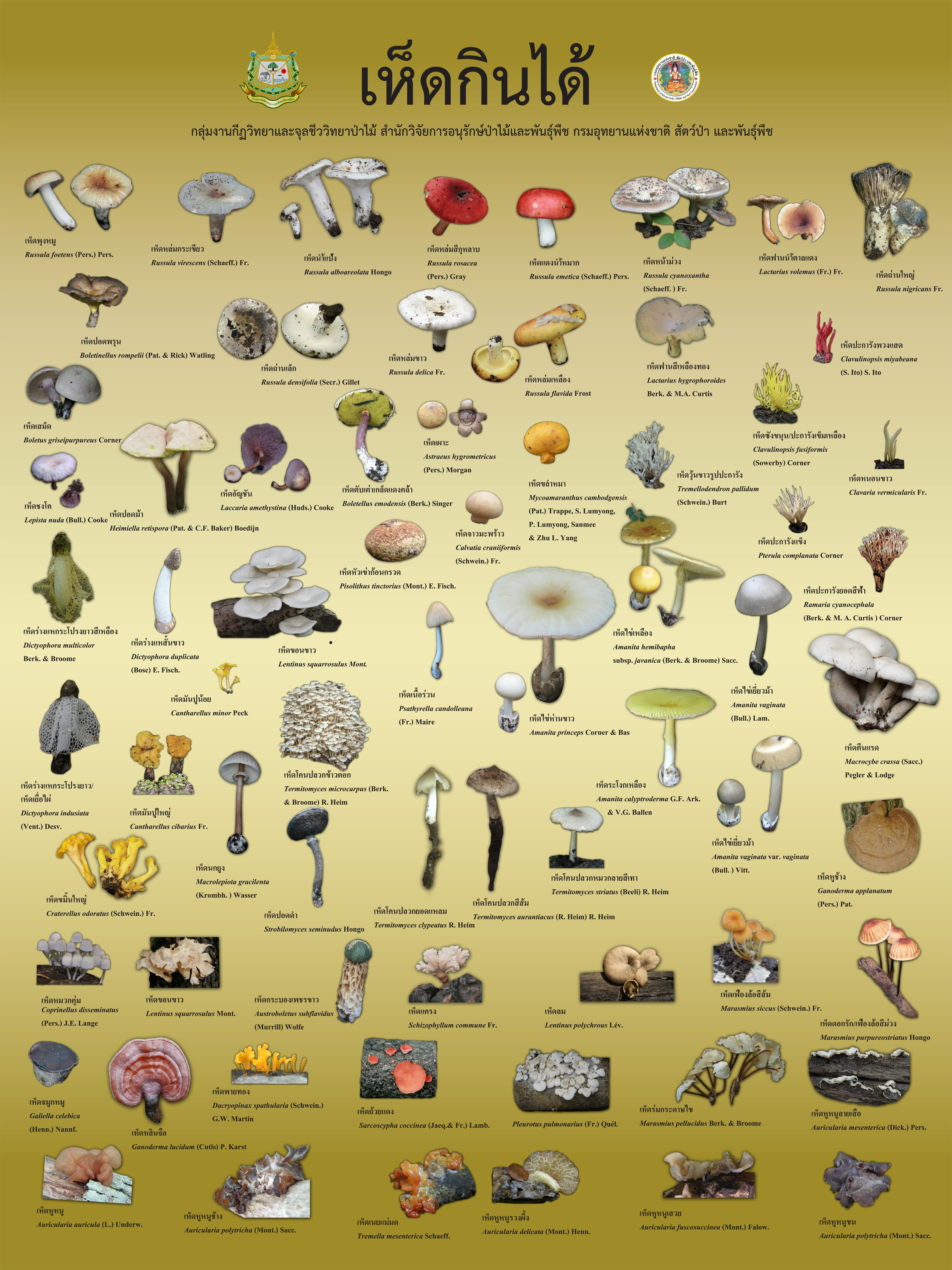 ข้อมูลเห็ดกินได้จาก สำนักวิจัยการอนุรักษ์ป่าไม้และพันธ์ุพืช กรมอุทยานแห่งชาติ สัตว์ป่า และพันธ์ุพืช